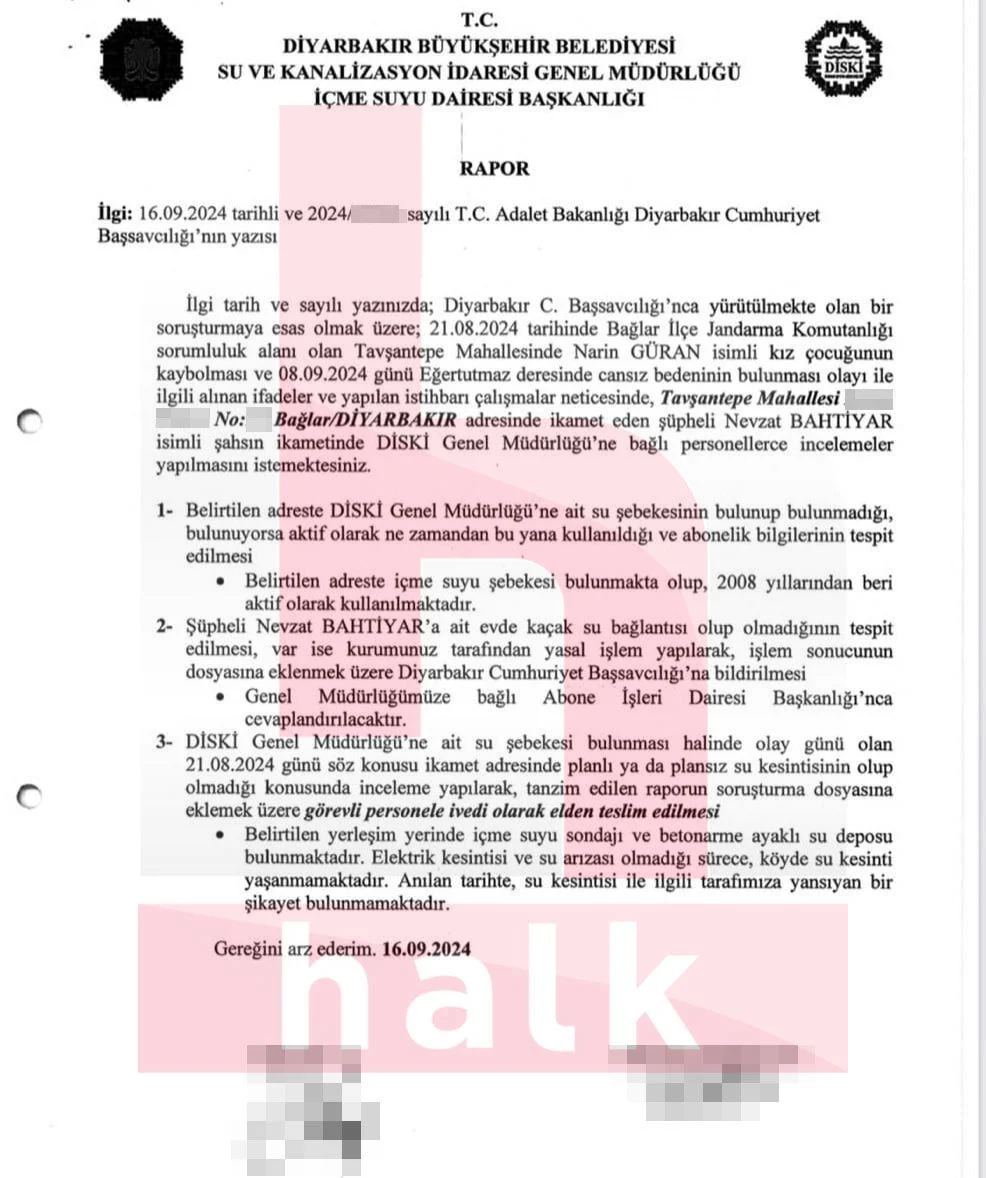 Narin Güran cinayetinde amca Salim Güran ve cesedi Eyertutmaz Deresi'ne taşıyan Nevzat Bahtiyar’ın saat 17.46’da "su kesintisi" nedeniyle görüştüklerine dair ifadelerinin doğru olmadığı DİSKİ raporuyla ortaya çıktı.