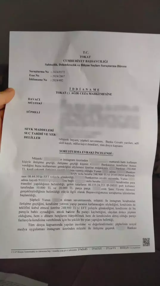 H.B.’nin suç duyurusu üzerine Yunus O. hakkında Tokat Cumhuriyet Başsavcılığı tarafından başlatılan soruşturma tamamlanarak iddianame hazırlandı. Şüpheli hakkında bilgisayar, cep telefonu, internet araçların kullanılması suretiyle haksız menfaat sağlama suçundan üç yıldan 10 yıla kadar hapis cezası istendi. İddianamede Yunus O.’nun H.B.’den yatırım yapıp parasının katlanacağını söyleyerek para istediği, H.B.’nin banka kredisi çekerek şüpheli Yunus O.’ya 248 bin 900 lira para gönderdiği, şüphelinin kendisine gönderilen tutarın 30 bin TL’si ile parça parça bahis oynadığı belirtildi.