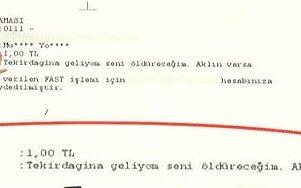 Hasan Y. eşi Berfin Y.’ye şiddetten uzaklaştırma cezası aldı. ‘İletişim araçlarıyla rahatsız etmesi’ de yasaklandı. Ancak o eşinin banka hesabına 1’er TL gönderip açıklama kısmına tehdit mesajları yazmayı sürdürdü.