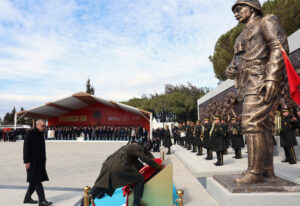 Cumhurbaşkanı Erdoğan’ın Şehitler Anıtı’na çelenk bırakmasının ardından saygı duruşunda bulunuldu, İstiklal Marşı okundu. Bu sırada askerlerce saygı atışı yapıldı.