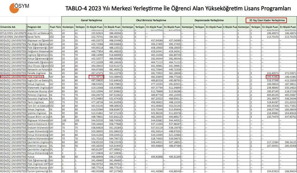 Bu kontenjan çerçevesinde üniversiteye yerleşen kadınlardan birinin tercihi Boğaziçi Fizik oldu. Bu yıl giren 60 öğrenci sayısaldan 511-533 arasında puan aldı. Okul birincisi kontenjanından giren iki öğrenci 482 ve 496 puan aldı. 35 yaş üstü kadın kontenjanından giren öğrenci 166 puan aldı. İkinci kadın kontenjanına ise başvuru olmadı.