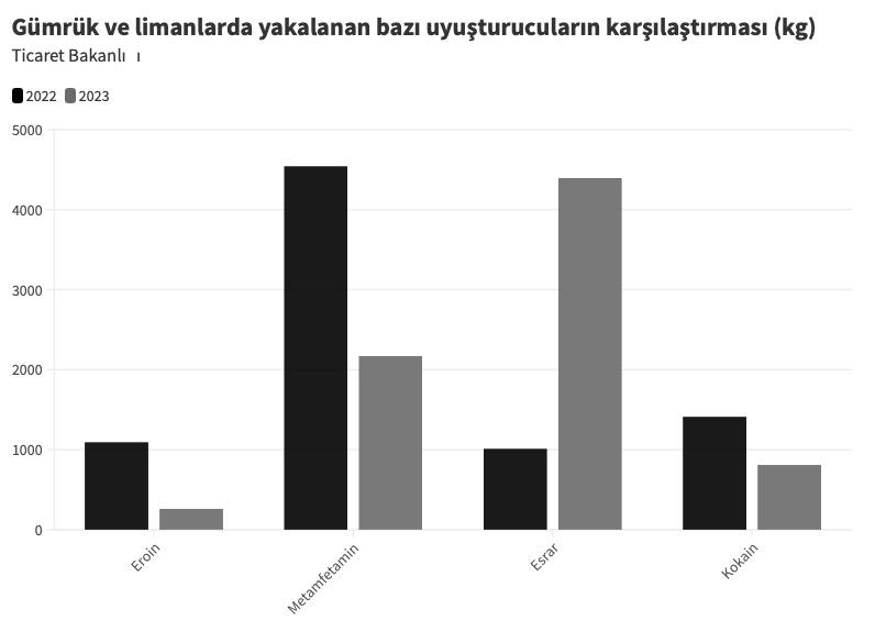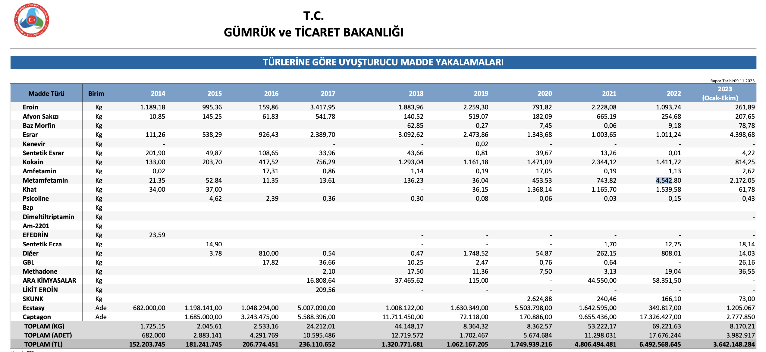 Gümrük ve Ticaret Bakanlığı Ekim 2023’e kadar 261 kilo 89 gram eroin, 814 kilo 25 gram kokain, 2 bin 172 kilo metamfetamin yakalandığını duyurdu.