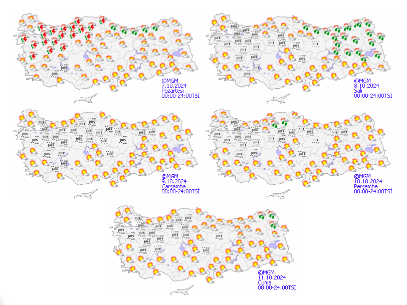 Meteoroloji Genel Müdürlüğü 7-11 Ekim 2024’e ilişkin haftalık hava tahminlerini açıkladı. Yurt genelinde mevsim normalleri üzerinde seyreden hava sıcaklıkları pazartesi günü kuzeybatı kesimlerde azalacak.