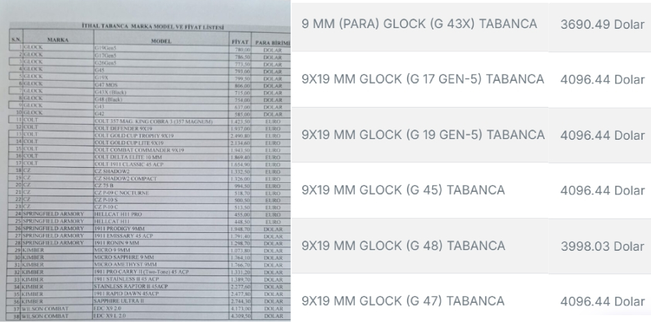 Silahların alımının Euro veya Dolar ile yapılması, ücretin Adalet Bakanlığı’nın banka hesabına yatırılması gerektiği belirtildi. MKE’nin ithal silah listesinde suikast silahı olarak bilinen Glock marka tabancanın da yer aldığı görüldü. Glock tabancaları dünya çapında polis, güvenlik güçleri ve ünlülerin yanı sıra suçlular tarafından kullanılmasıyla biliniyor.