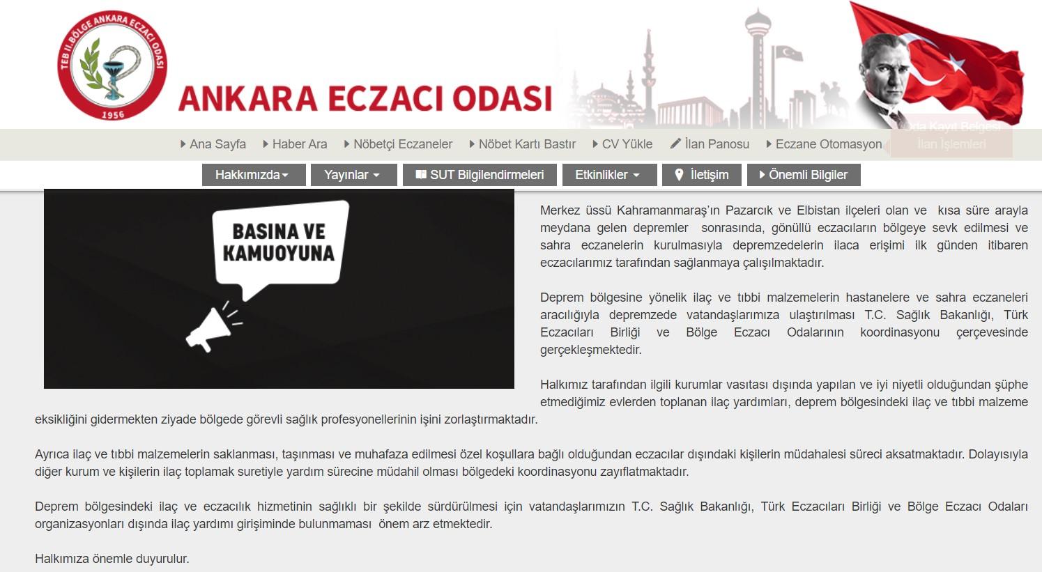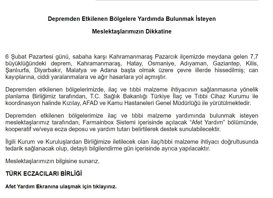 Türk Eczacıları Birliği depremin hemen ardından kampanya başlattı ve meslektaşlarına çağrı yaptı.