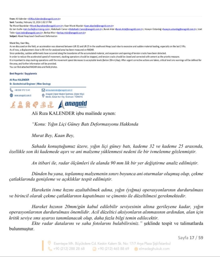 E-postada şirketin jeoteknik mühendisi Ali Rıza Kalender’in madendeki gelişmelerle ilgili teknik bilgileri verip operasyonların acilen durdurulmasını önerdiği görülüyor.