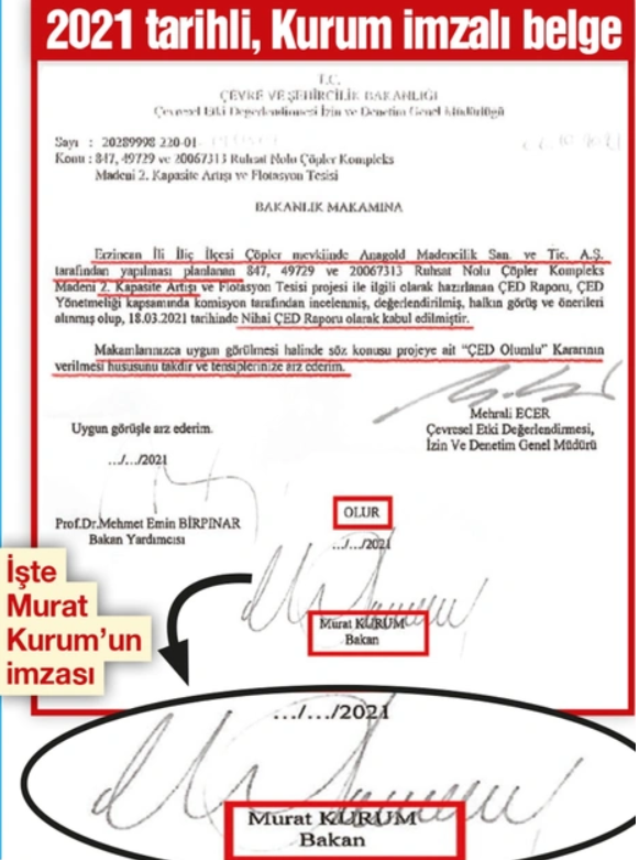 Murat Kurum'un kapasite artırımına 'olur' imzası attığı belge Erzincan’ın İliç ilçesinde ABD merkezli Anagold ile Çalık Holding’in işlettiği Çöpler altın madeninde 13 Şubat’ta 10 milyon tondan fazla siyanürlü toprağın kayması sonucu 9 işçi toprak altında kaldı. Devasa liç yığınıyla ilgili soruşturmada ilk 100 günde 9 kişi tutuklandı.