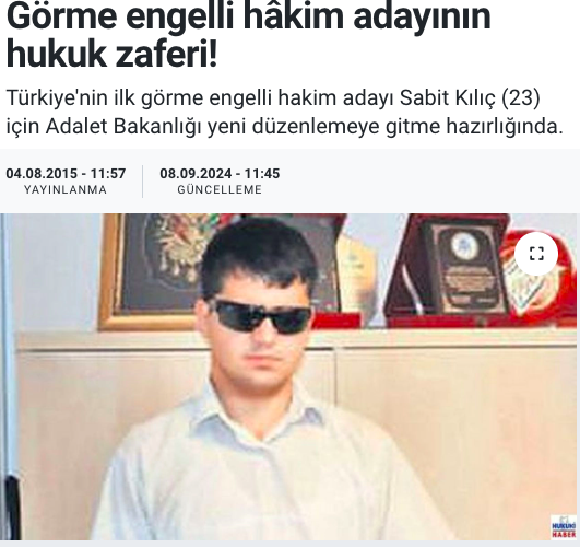 Türkiye'nin ilk görme engelli hakimi Sabit Kılıç'ın dokuz yıl önce atanmasına engel olan madde halen yürürlükte. Dün hemen tüm internet sitelerinde, gazete ve televizyonlarda “Türkiye’nin ilk görme engelli hakimi göreve başlıyor” haberleri yer aldı. Evet, gerçekten de Türkiye’de ilk kez bir görme engelli hakim olarak atanmıştı. Peki kimdi atanan bu hakim ve ataması nasıl yapılmıştı? Aslında öykü oldukça ilginç. Çünkü, Türkiye’nin ilk görme engelli hakimi olarak atanan 32 yaşındaki Sabit Kılıç, aslında 2015 yılında hakim olarak atanma hakkı kazanmış ama Adalet Bakanlığı yerine Aile ve Sosyal Hizmetler Bakanlığı’nda işe alınmıştı. Kılıç Adalet Bakanlığı bünyesine geçmek ve hakim olarak atanabilmek için uzun bir mücadele verdi, mücadelesinin her aşamasında da akademik başarılarıyla kendinden söz ettirdi.