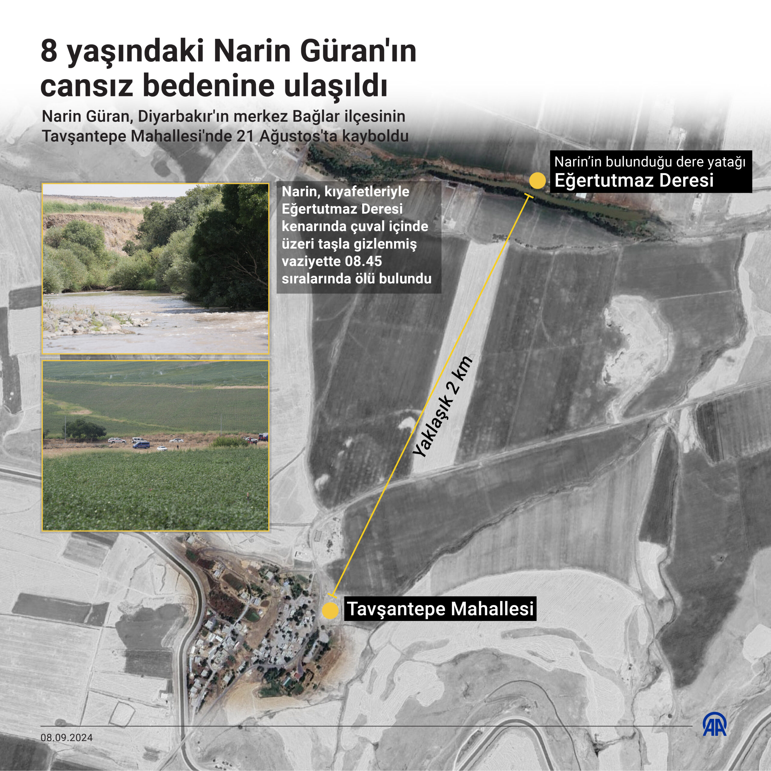 Yolda giderken pişmanlık duydum ancak aldığım şeyden de kurtulmamın gerektiğini düşündüm. Derenin yanındaki stabilize yoldan aşağı inerek uygun bir yere baktım. Aracımı derenin kenarına durdurdum. Çuvalı aracımdan alarak elime aldım. Çocuğun tüm vücudu çuvala sığmıştı. Çocuğun ayağının kesik olup olmadığını hatırlamıyorum. Çünkü çok telaşlıydım. 8 Eylül tarihinde Narin Güran’ın bulunduğu yere inerek ip aradım. İp bulamayınca çocuğun çantasının ipi aklıma geldi.