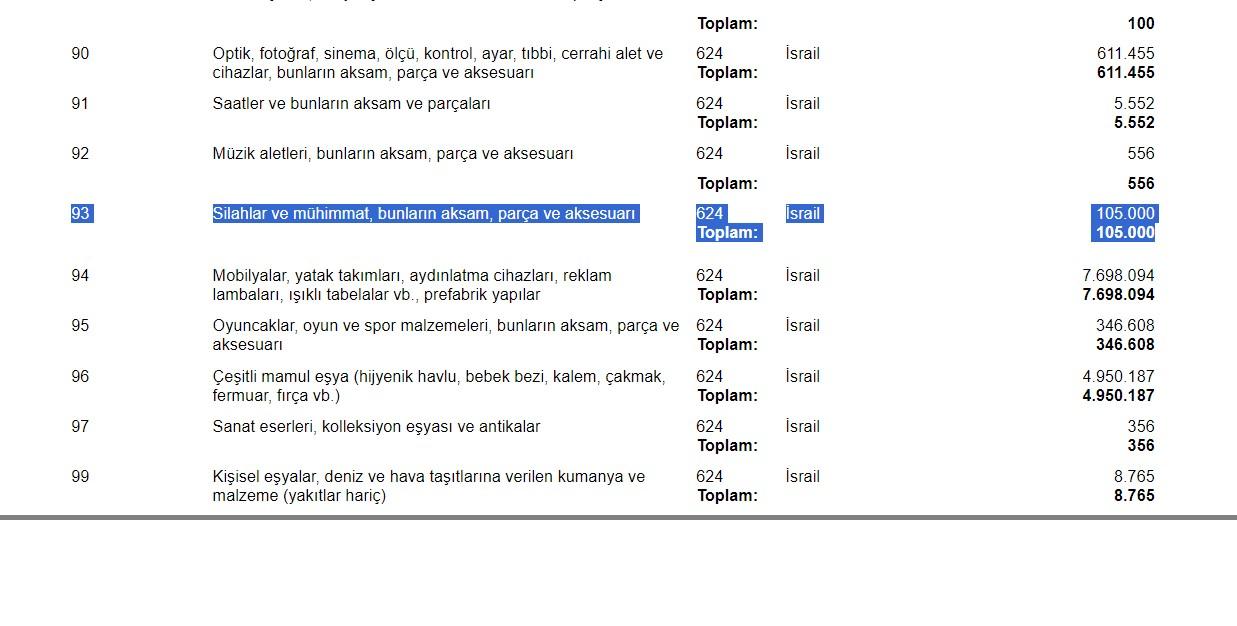 İsrail'e Türkiye'den satılan ürünler tartışma konusu olmaya devam ediyor. TÜİK'in verilerine göre Gazze saldırısının başladığı Ekim ayında İsrail'e 105 bin dolarlık silah satışı yapıldı.