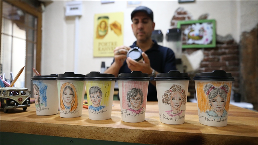 Portrelerin iki kattan oluşan karton bardaklara çizildiğini dile getiren Aygün, “Bir bardakta kahve sunuyoruz, diğer bardağı da portrelerini çizdiğimiz misafirlerimize hediye olarak veriyoruz. Müşterilerden çok talep görüyoruz.” dedi.