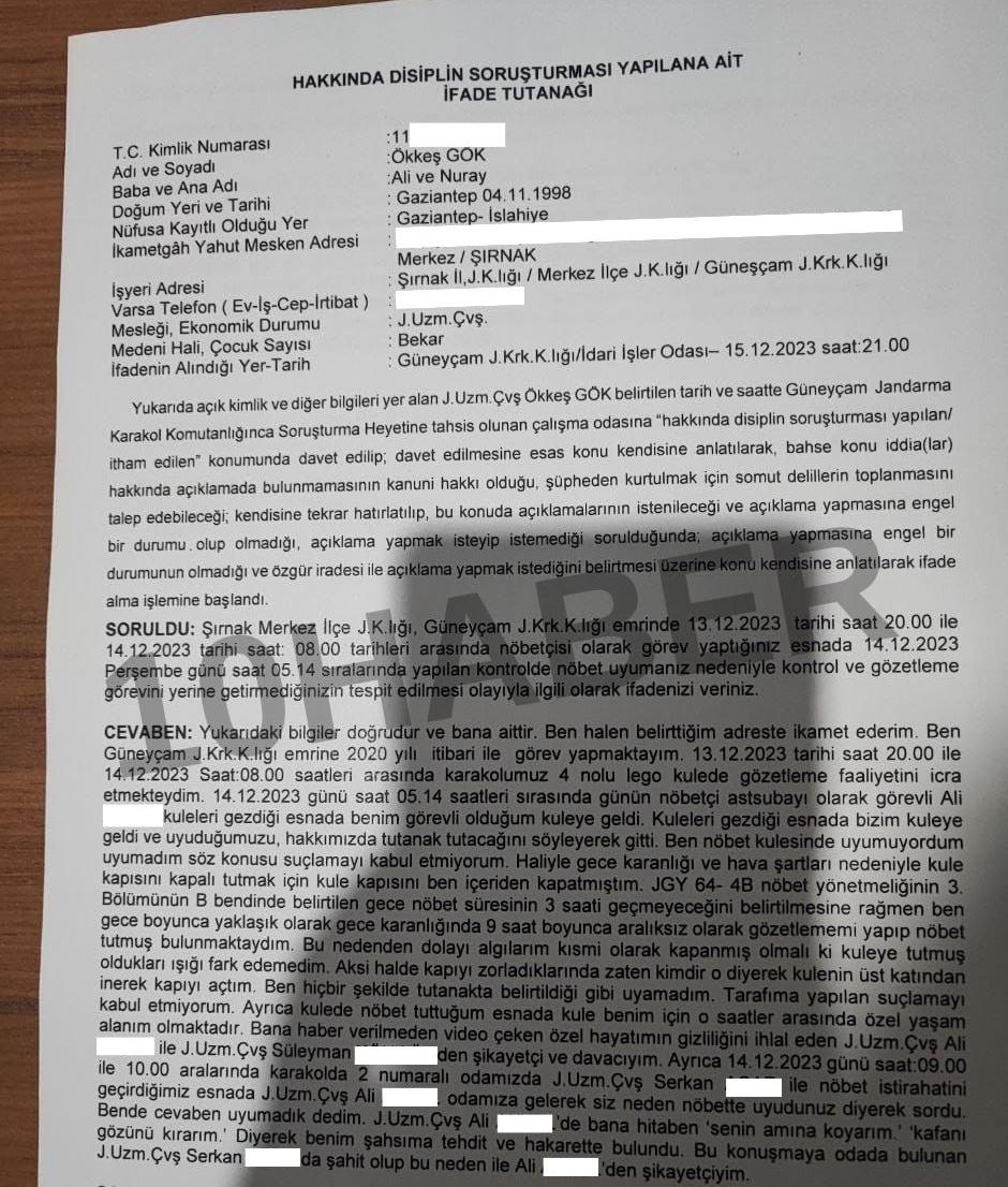 Gök’ün mektubu bir yana, 10Haber’in ulaştığı 15 Aralık tarihli disiplin soruşturması tutanağında Gök yaşadıklarını “Ben 2020 yılı itibari ile görev yapmaktayım. 13 Aralık saat 20.00 ile 14 Aralık saat 08.00 arasında nöbetteydim. 14 Aralık sabah 05.14 saatlerinde sırasında nöbetçi astsubay Ali A. nöbet kulelerini gezerken benim görevli olduğum kuleye geldi. Uyuduğumuzu, hakkımızda tutanak tutacağını söyleyerek gitti. Ben uyumuyordum. Suçlamayı kabul etmiyorum. Yönetmelikte nöbet süresinin 3 saati geçmeyeceği belirtilmesine rağmen ben gece boyunca yaklaşık 9 saat aralıksız nöbet tuttum. Bu nedenle kuleye tuttuğu ışığı fark etmemiş olabilirim” diye anlattı.