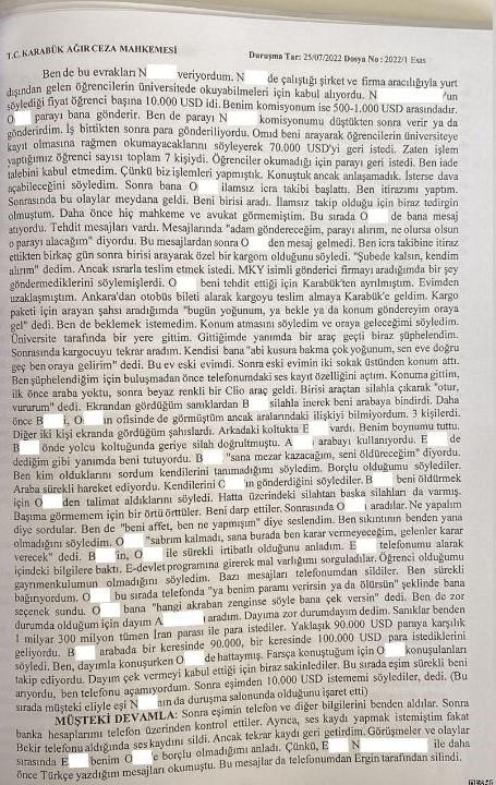 Karabük Ağır Ceza Mahkemesi’nde 2022/1 esas numaralı dosyada A.F., kendisine O.E., aracılığıyla gelen öğrencileri N.M., kanalıyla üniversiteye yerleştirdiğini söylüyordu. O.E.,’den öğrenci başına 10 bin dolar alıyor, N.M.,’ye gönderiyordu. Ancak O.E., aracılığıyla gelen 7 öğrenci üniversiteye kayıt yaptırdıktan sonra okumaktan vazgeçmişti. O.E., 7 öğrenci için gönderdiği 70 bin doları geri istemiş A.F., ise göndermemişti.