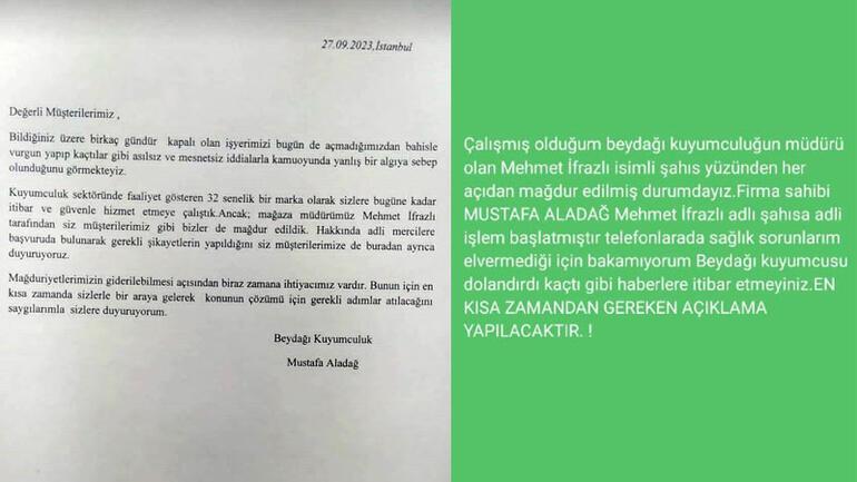 Kuyumculuk sektöründe faaliyet gösteren 32 senelik bir marka olarak sizlere bugüne kadar itibar ve güvenle hizmet etmeye çalıştık ancak; mağaza müdürümüz Mehmet İfrazlı tarafından siz müşterilerimiz gibi bizler de mağdur edildik. Hakkında adli mercilere başvuruda bulunarak gerekli şikâyetlerin yapıldığını siz müşterilerimize de buradan ayrıca duyuruyoruz. Mağduriyetlerimizin giderilebilmesi açısından biraz zamana ihtiyacımız vardır. Bunun için en kısa zamanda sizlerle bir araya gelerek konunun çözümü için gerekli adımlar atılacağını saygılarımla sizlere duyuruyorum” dedi.