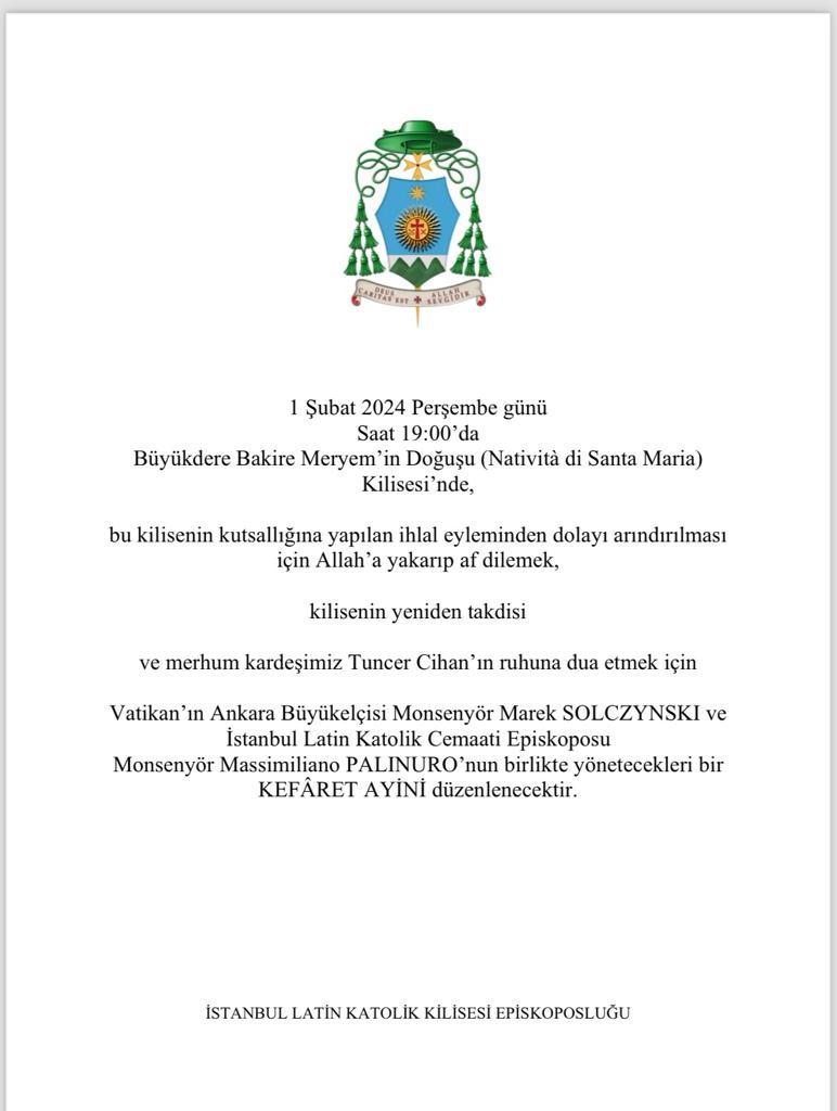 1 Şubat Perşembe günü saat 19.00’da yapılacak “Kefaret Ayini” için İstanbul Latin Katolik Kilisesi Episkoposluğu da çağrı yayınladı.