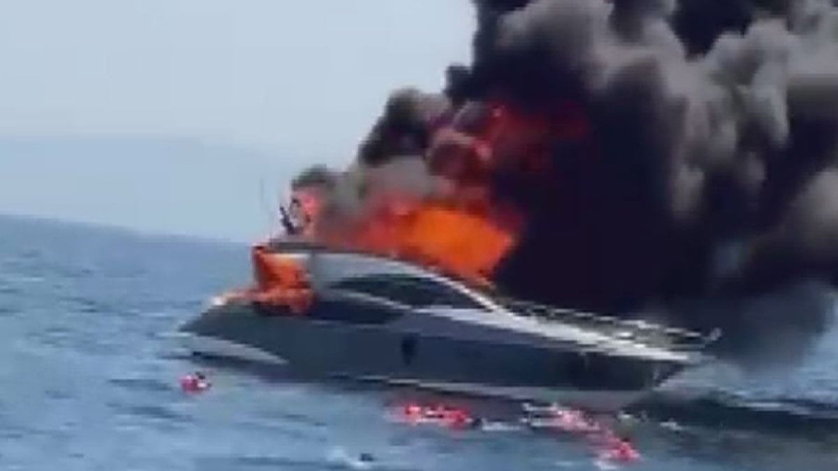 Yolcular yanan tekneden denize atladı. Ekipler denizdeki yolcuları kurtardı.