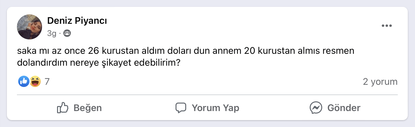 Grupta ekonominin toparlanmış olduğu duruma örnek veren kullanıcılar, “Şaka mı? az önce 26 kuruştan aldım doları. Dün annem 20 kuruştan almış. Resmen dolandırıldım. Nereye şikayet edebilirim?” diyerek rekor seviyeye çıkan Dolar/TL kurunun düştüğünde yaşanabilecekleri anlatıyor.