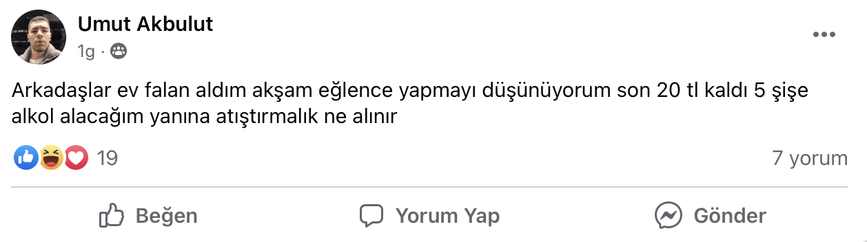 Alkol fiyatlarındaki astronomik artış da gruptakilerin gündeminde. Bir kişi akşam yapacağı eğlence için 20 TL karşılığında beş şişe alkol aldığını belirtirken gruptaki katılımcılara, “Yanına atıştırmalık ne alınır?” diye soruyor.