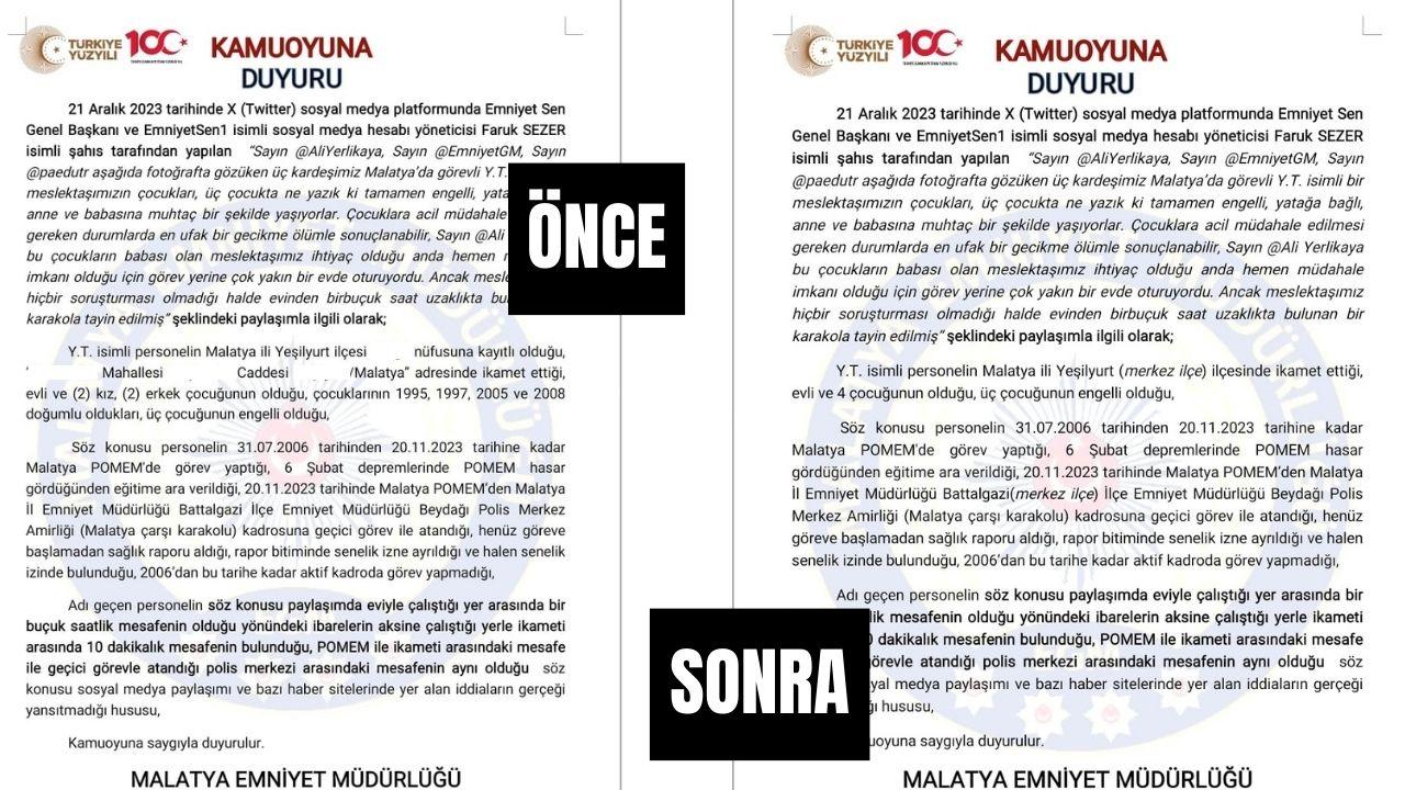 Olayın gündeme gelmesinin ardından 23 Aralık akşam saatlerinde Malatya İl Emniyet Müdürlüğü’nün sosyal medya hesabından bir açıklama yayınlandı. Açıklamada, polis memurunun evine 10 dakikalık mesafedeki karakola atandığı belirtilirken açıklanan iki karakol arasının 12 kilometre olduğundan söz edilmedi.