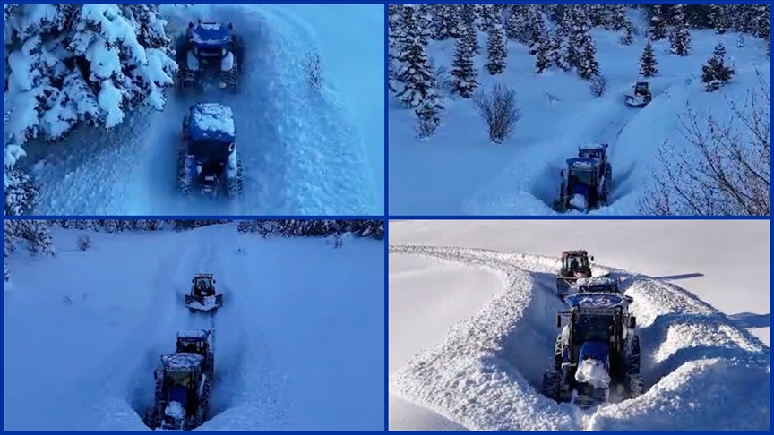 Sezer arka arkaya bağladığı traktörlerle karlı yolları açarken çektiği görüntüleri sosyal medyasında paylaştı.
