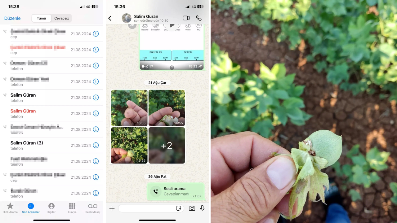 “İlk aramayı saat 16.43’te yaptı. Köydeki pamuk tarlamın kurtlandığını söyledi. Saat 16.55’te tarladan fotoğraf atıp ‘İlaçlama yapayım mı?’ diye sordu. Sesi çok rahattı. Hiçbir titreme ya da tedirginlik hissetmedim. Sesinde panik hali yoktu. Farklı bir şey de söylemedi. Hatta tatilde olduğum için ‘Tatil nasıl gidiyor?’ diye de takıldı.”