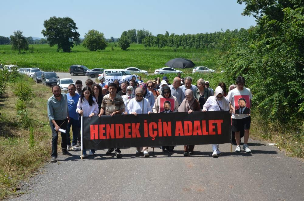‘Hendek için adalet’ pankartıyla yürüyen kederli aileler, hukuki süreçte en başından beri savunucuları olan ve şu anda vekil seçildiği halde hapishanede tutulan Av. Can Atalay’ın fotoğraflarını taşıdılar.