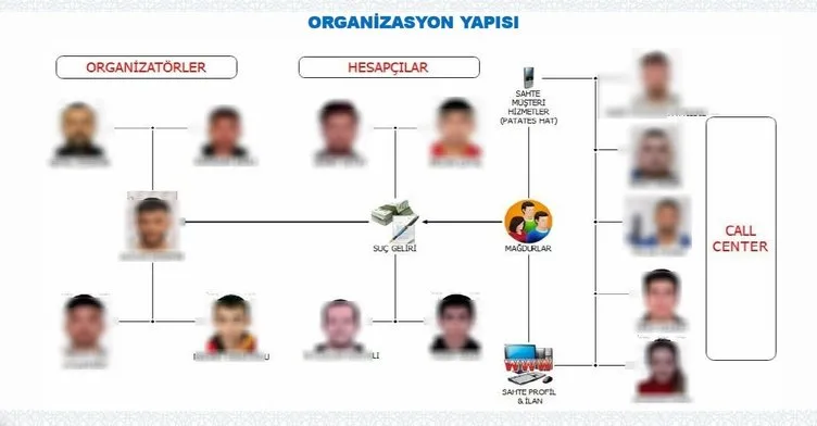 Siber polisi M.A’nın ifadesi doğrultusunda yaptığı çalışmada şebekenin organizatörler, hesapçılar ve çağrı merkezi olarak üç gruba ayrıldığını belirledi. Mersin’de yaşayan Kemal ile Alican Ö. kardeşlerin yönettiği şebekenin bungalov ev ilanı, ikinci el ürün satışı ve sosyal medyada açılan sahte kadın profilleriyle tuzağa düşürdükleri erkekleri şantajla dolandırdığı anlaşıldı. Şebekenin banka hesapları kontrol eden polis 250 mağdurun beş milyon lirasının dolandırıldığını tespit etti.