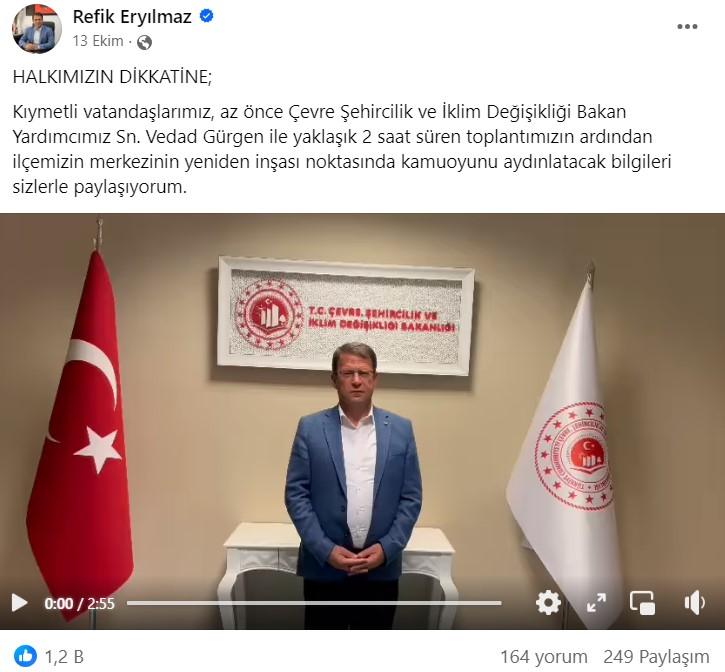 Eryılmaz daha önce Facebook hesabından bir video paylaşmış ve Samandağ çarşısının yeniden yapılandırılması için bakanlıkla görüştüklerini anlatmış, bunu ‘baltalamaya çalışanlar olduğunu’ söylemişti. Eryılmaz 13 Ekim’de paylaştığı o videoda mahalle ismi ve hektar büyüklüğünden bahsetmemiş, ama şunları söylemişti:
