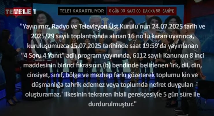 Radyo ve Televizyon Üst Kurulu, Basın Özgürlüğü İçin Mücadele Günü’nün yıldönümü olan 24 Temmuz’da TELE1’e ‘halkı kin ve düşmanlığa tahrik’ iddiasıyla beş gün karartma ve yüzde 5 para cezası vermişti.