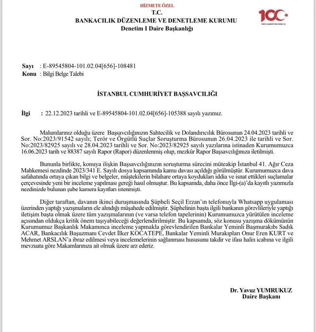 Bankacılık Düzenleme ve Denetleme Kurumu (BDDK) İstanbul Cumhuriyet Başsavcılığı’na yazı göndererek Seçil Erzan dosyasında yer alan telefon mesajı ve tanık beyanı gibi delilleri istedi. BDDK’nın yazısında yeni deliller üstünden yeniden değerlendirilme yapılması ve yeni rapor yazılması gerekliliğine işaret edildi.
