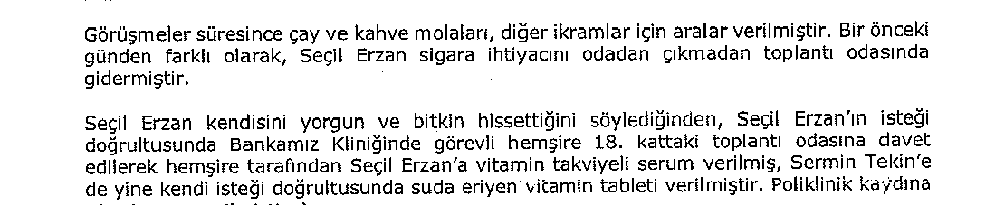 “Görüşmeler süresince çay ve kahve molaları, diğer ikramlar için aralar verilmiştir. Bir önce günden farklı olarak, Seçil Erzan sigara ihtiyacını odadan çıkmadan toplantı odasında gidermiştir. Seçil Erzan kendisini yorgun ve bitkin hissettiğini söylediğinden isteği doğrultusunda Bankamız Kliniğinde görevli hemşire 18. kattaki toplantı odasına davet edilerek hemşire tarafından Seçil Erzan’a vitamin takviyeli serum verilmiş, Sermin Tekin’e de yine isteği doğrultusunda suda eriyen vitamin tableti verilmiştir.”