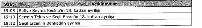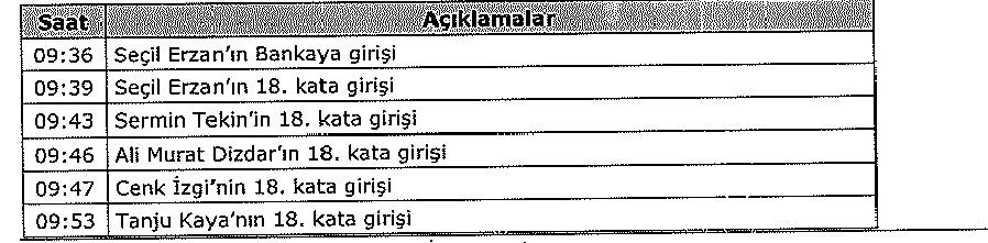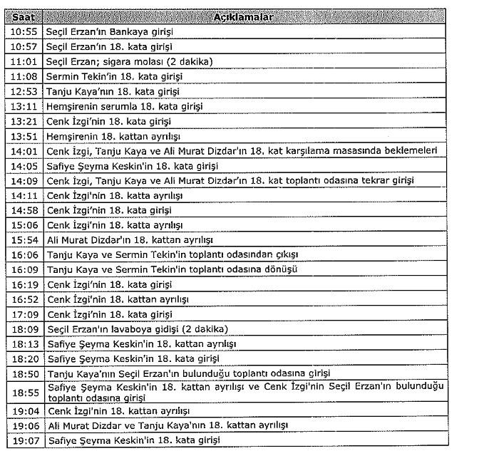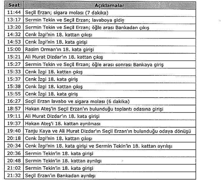 Saat 13.36’da Seçil Erzan Sermin Tekin’le birlikte Göktürk’teki evine giderek not kağıtlarını alıp tekrar banka genel müdürlüğü binasına geldi. Toplantıya 18.57’de Denizbank Genel Müdür Hakan Ateş de katıldı. Toplantı 21.32’de bitti. Seçil Erzan Çorlu’daki eve geri döndü.
