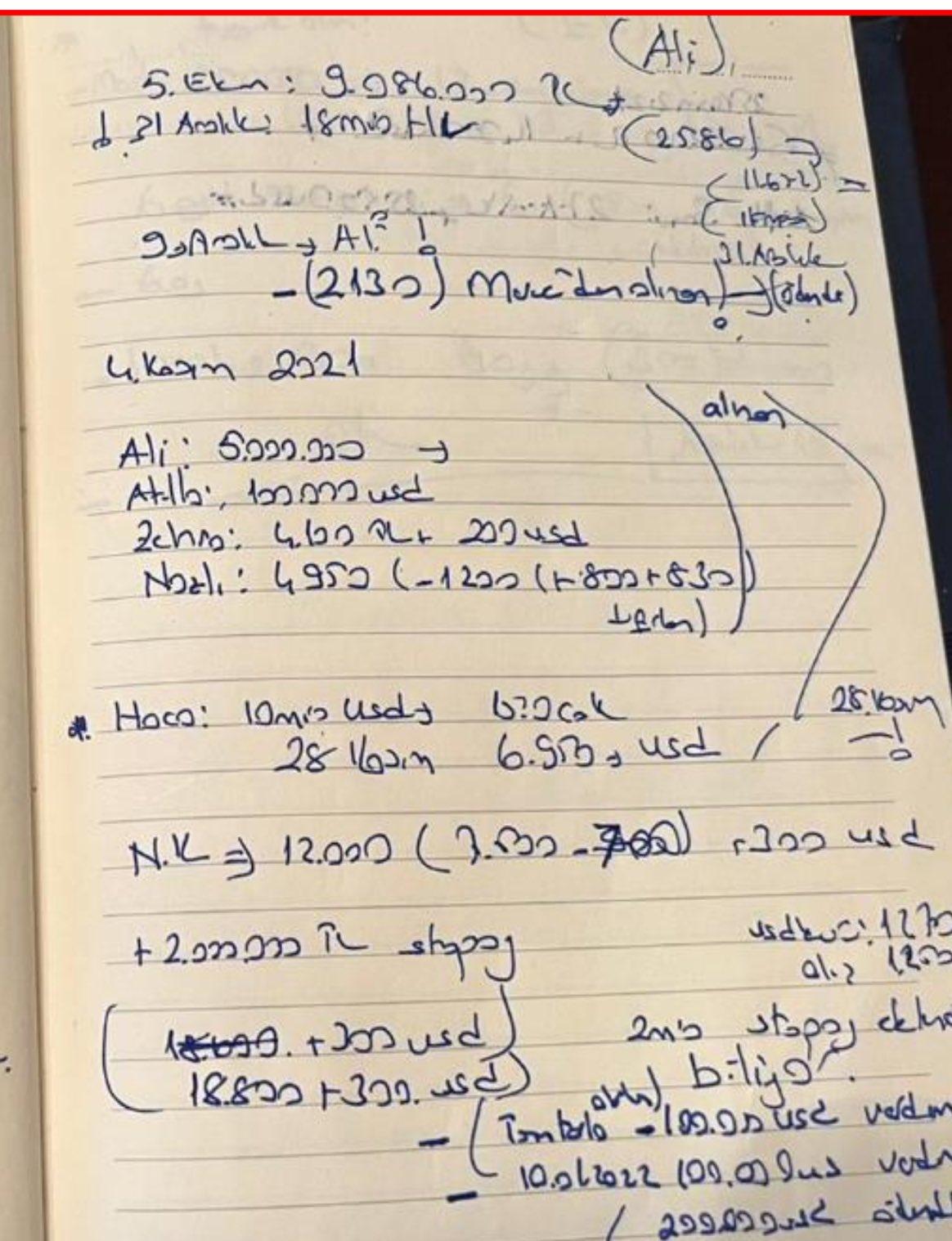 Seçil Erzan’ın tuttuğu notların görsellerinin de yer aldığı raporda Erzan’ın ‘F.T’ ve ‘HOCA’ diye kod verdiği kişiden alınan ve verilen para şöyle kaydedilmiş:
