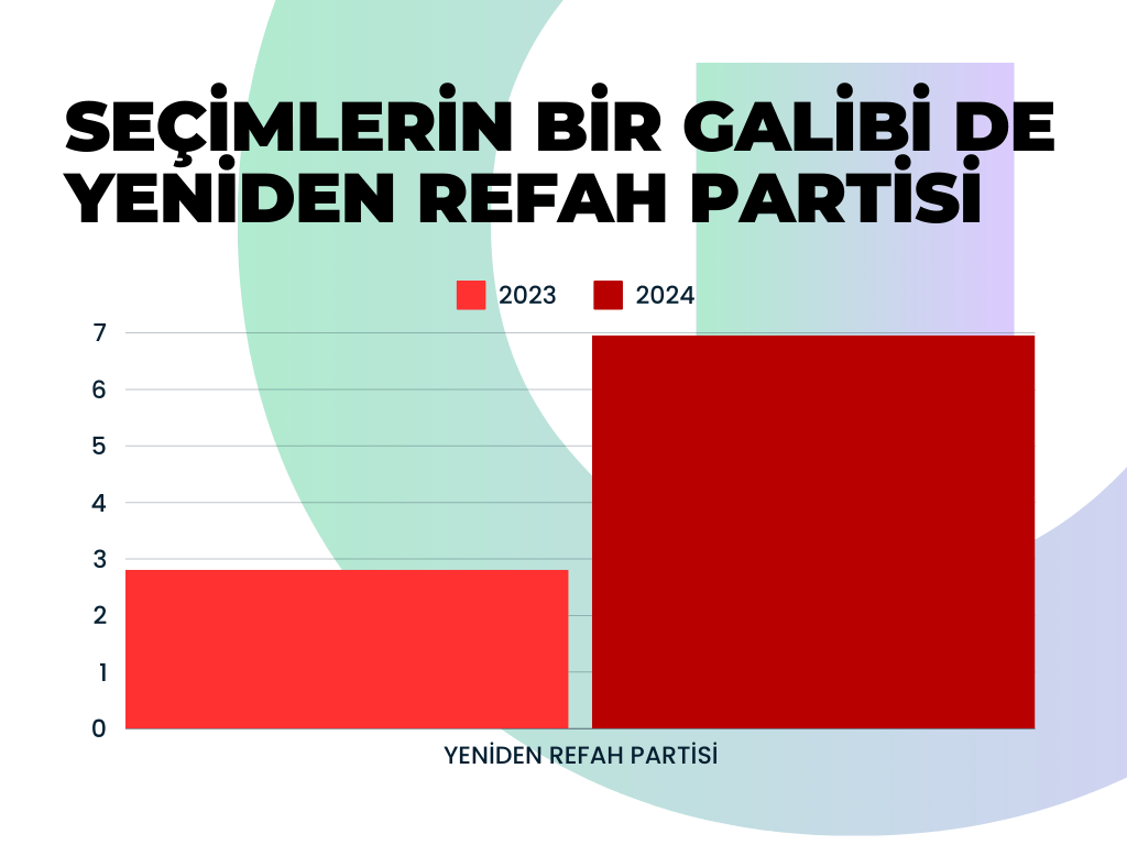 Dr. Fatih Erbakan liderliğindeki Yeniden Refah Partisi yerel seçimlerden kârlı çıkan iki partiden biriydi. Belediye başkanlığı pazarlığında Adalet ve Kalkınma Partisi (AKP) ile anlaşamadığı için Cumhur İttifakı ile yollarını ayıran Yeniden Refah Partisi (YRP) yerel seçimlerin Cumhuriyet Halk Partisi’nden (CHP) sonra en kârlı partisi oldu. Katıldığı ilk seçim olan 14 Mayıs 2023 milletvekili genel seçiminde Türkiye genelinde yüzde 2,8 oranında oy alan YRP Türkiye’de her seçim bölgesinde oyları artırmayı başarırken, AK Parti’nin birçok yerde seçimi kaybetmesine neden oldu. Son verilere göre YRP’nin oy oranı yüzde 7’ye yaklaşarak 14 Mayıs seçimlerinde üçüncü parti olan MHP’nin önüne geçti.