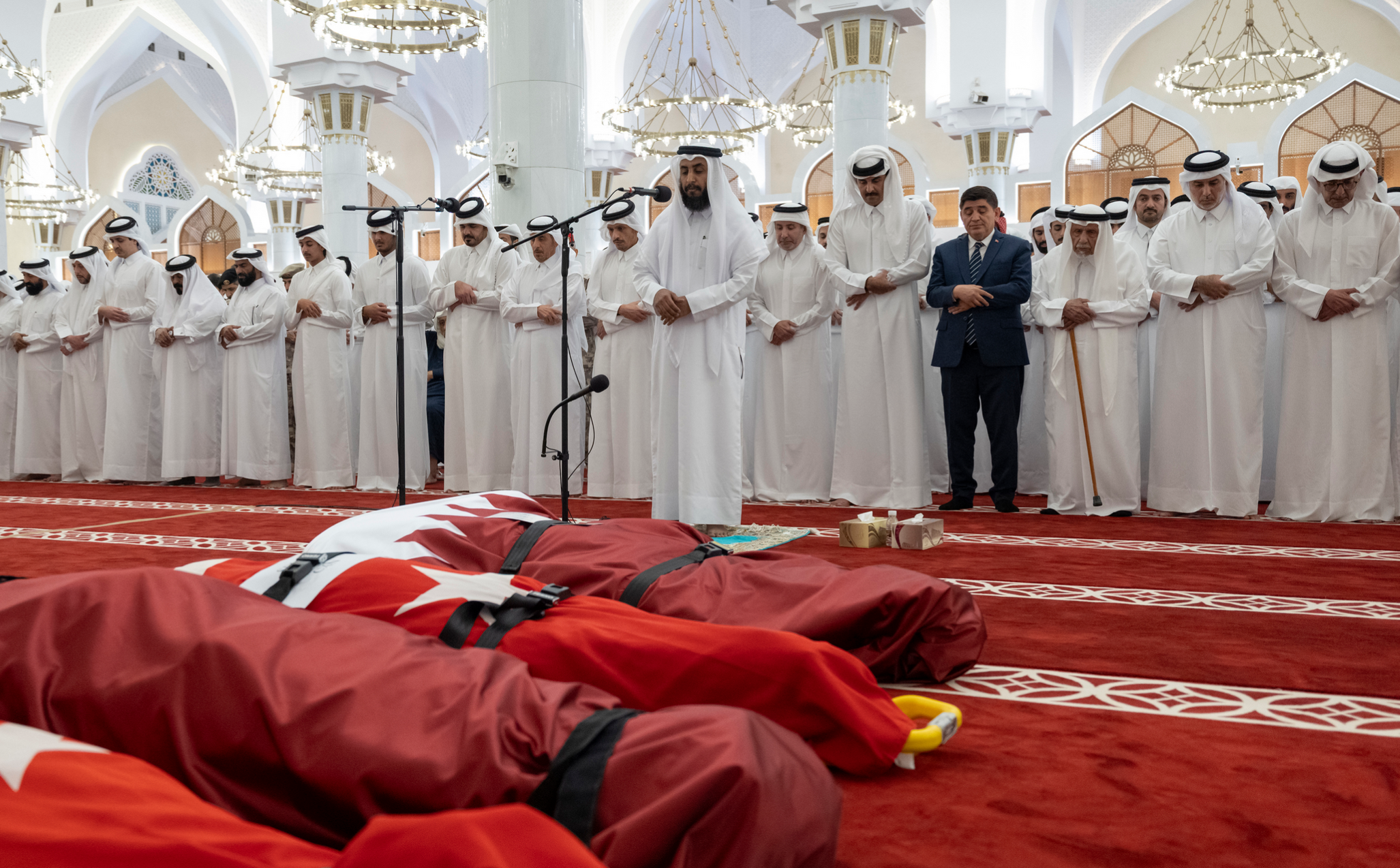Doha’daki İmam Muhammed bin Abdülvahhab Camii’nde Katar Emiri Temim bin Hamed Al Sani ve Türkiye’nin Doha Büyükelçisi’nin de katılımıyla cemaat Hava Savunma Binbaşı Sinan Taştekin ile ASELSAN teknisyenleri Süleyman Cemre Kahraman ve İsmail Enes Can için namaza durdu.