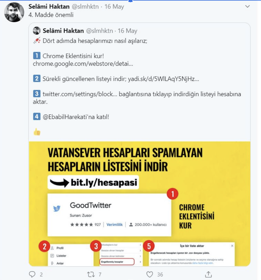 Haktan için durum değişmiş olacak ki şimdi Ebabil Harekatı hakkında yaklaşık bir yıldır hiçbir paylaşım yapmıyor. En son paylaşımında, “Türk devletine düşman olanların hesabını, Twitter herkese tavsiye ediyor. İlk üye olanlara da bu ihanet hesaplarını zorla takip ettiriyor. O yüzden hainlerin sosyal medya hesaplarının takipçi sayısına çok takılmayın. Bir ebabil ordusu gelir. Defterlerini dürer” diyen Haktan, takipçilerine Ak Parti İstanbul İl Başkanı Osman Nuri Kabaktepe’yi takip etmelerini öneriyordu.
