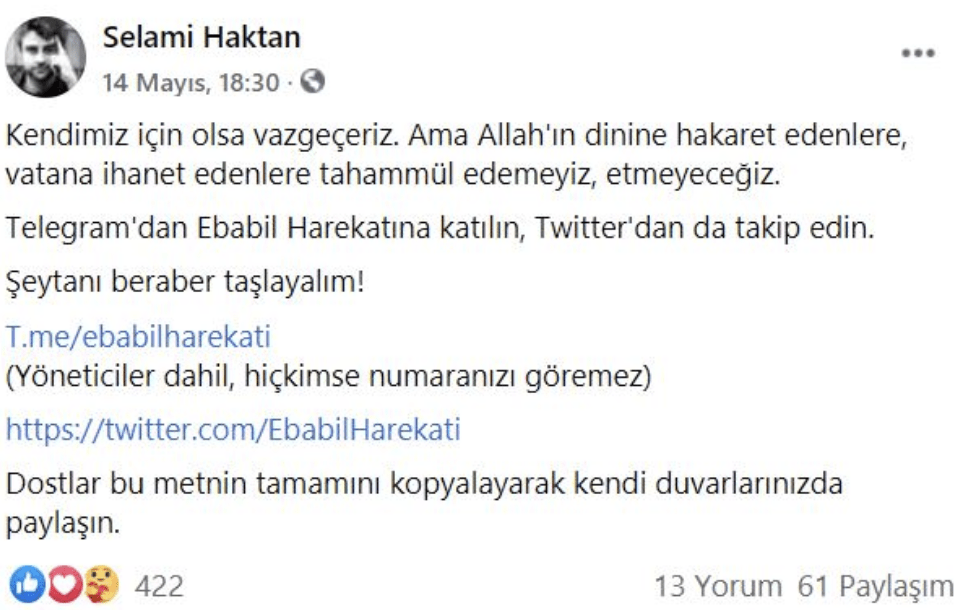 Selami Haktan’ın Ebabil Harekatı grubunu kurduklarını söylediği paylaşımı.