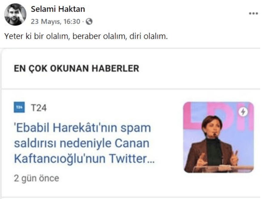Selami Haktan isimli kullanıcının Facebook’tan yaptığı paylaşım.