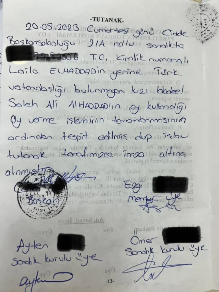 Türkiye Cumhuriyeti vatandaşı olmayan Hadeel Salih Ali Alhaddad’ın annesinin yerine oy kullandığının tespit edilmesinin ardından tutanak tutuldu.