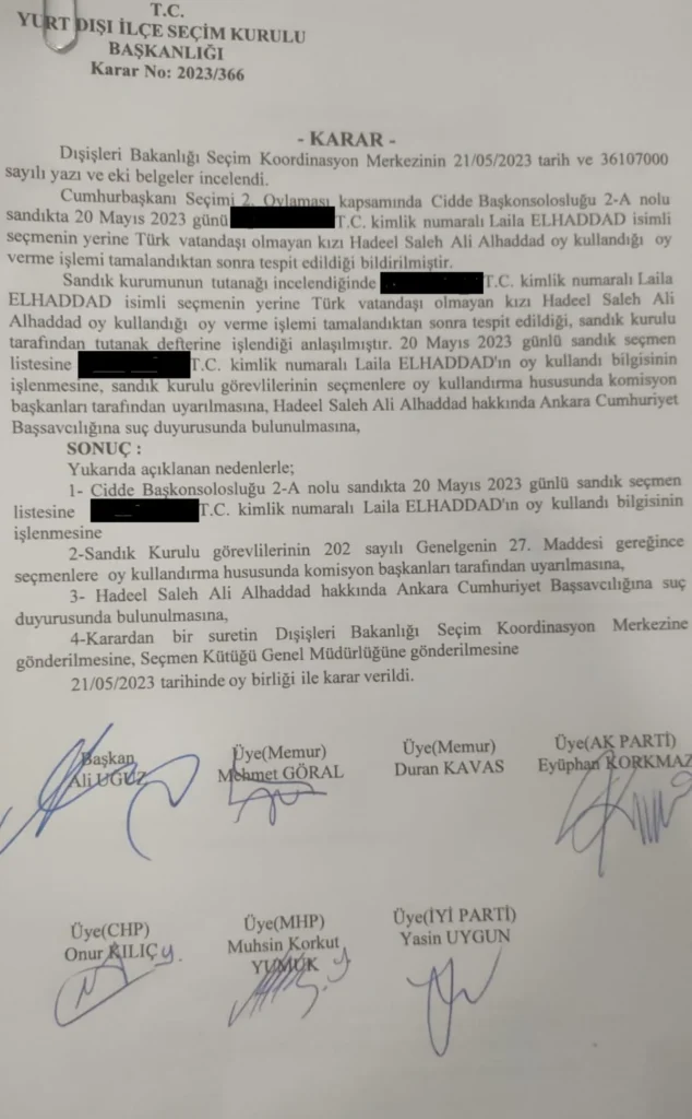 Suudi Arabistan’ın Cidde Başkonsolosluğu’nda 2A Nolu sandıkta Türkiye Cumhuriyeti vatandaşı Filistinli Laila Elhaddad adlı seçmenin yerine Türkiye Cumhuriyeti vatandaşı olmayan kızı Hadeel Salih Ali Alhaddad oy kullandı.