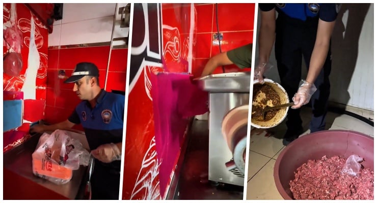 Tahmazoğlu tarafından paylaşılan görüntülerde, zabıta ekiplerinin kıyma makinesini yan tarafa çektiğinde duvarda bir bölme bulunması, kıyma makinesinin altına yapılan düzenek, tarihi geçmiş, satışa uygun olmayan etler ve ürünler yer alıyor.