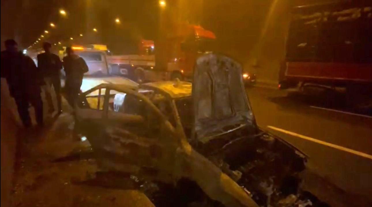 Tünel içinde yanan otomobil kazaya neden oldu.