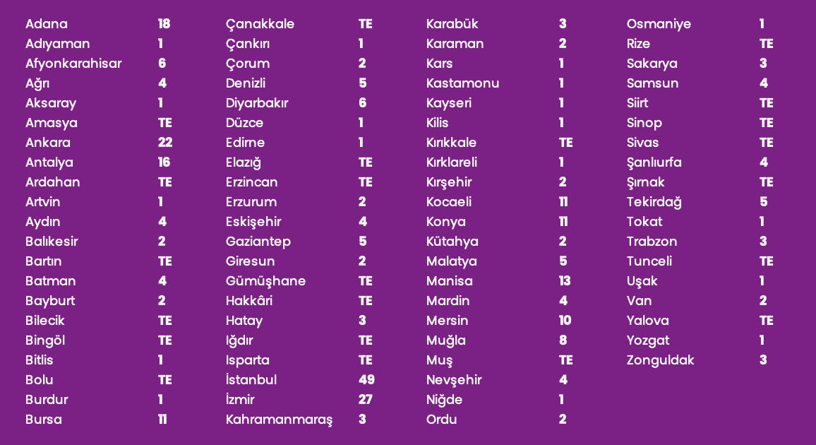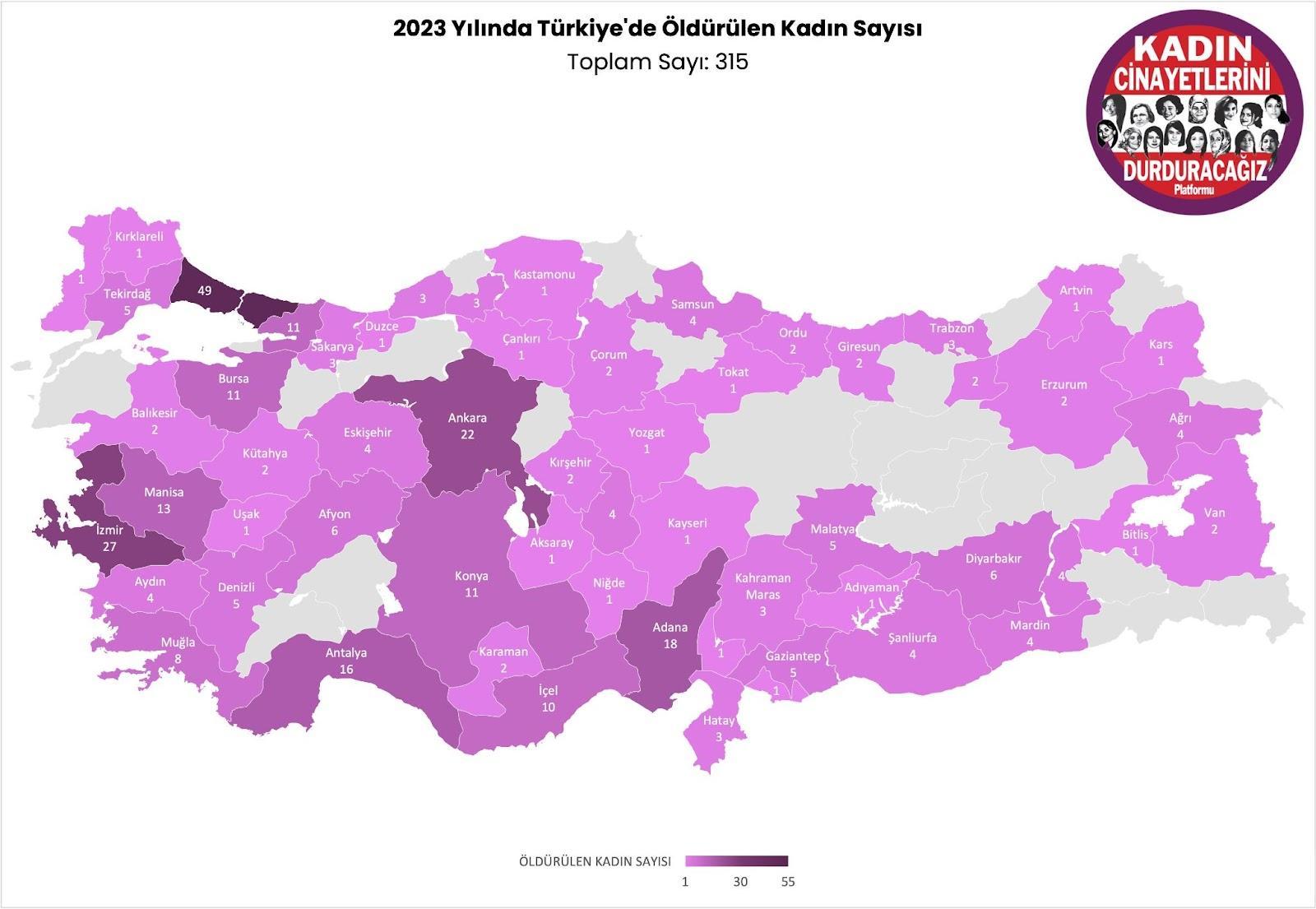 Son kadın cinayeti haberimize buradan bakabilirsiniz. Altta, hangi ilde kaç kadın öldürüldüğünün listesi, daha altta ise Türkiye haritasına dağılımı görülüyor.