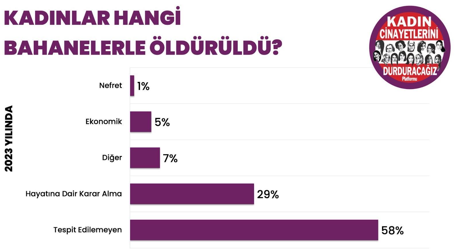 2023 yılında öldürülen kadınların %58’inin hangi bahaneyle öldürüldüğü tespit edilemedi. Kadınların hayatlarını kaybetmesine sebep olan şiddet olaylarında nedenleri ve failin kimliği açığa çıkarılmadıkça, suçluların hesap vermesi ve toplumun önleyici önlemler alması engellenmiş olur. Bahanesi bilinen kadın cinayetleri arasında ise kadınların yaklaşık %70’i hayatlarına dair karar aldıkları için erkekler tarafından öldürüldü. Bu demek oluyor ki kadınlar en çok ayrılık, boşanma vb. gibi kendi özgür iradeleriyle hayatlarına dair aldıkları kararlar nedeniyle ölüme sürükleniyor.