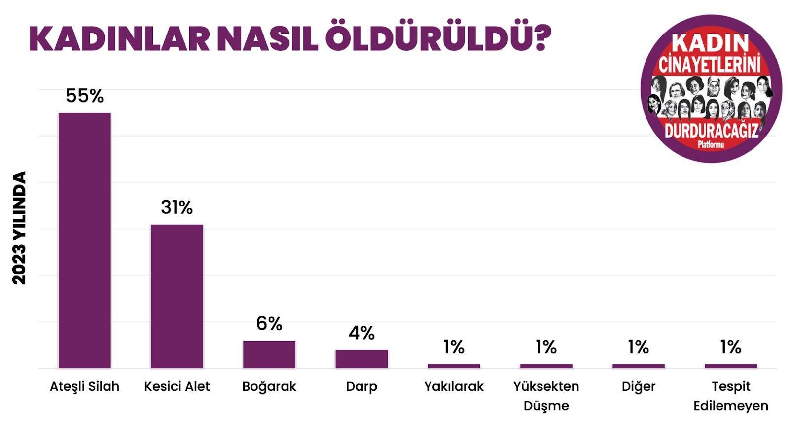 Bu yıl öldürülen kadınların %31’i bir kesici aletle bıçaklanarak, %55’i bir ateşli silahla vurularak öldürüldü. 2022 yılında da olan kadın cinayetlerinin %60’ının ateşli silahlarla olması Türkiye’deki bireysel silahlanma hakkındaki yasal düzenlemelerin ne kadar eksik olduğunu kanıtlıyor. Ruhsatsız ateşli silahlara erişimin kolaylığı ve denetimlerin eksikliğinin bedelini kadınlar yaşamlarıyla ödüyor.