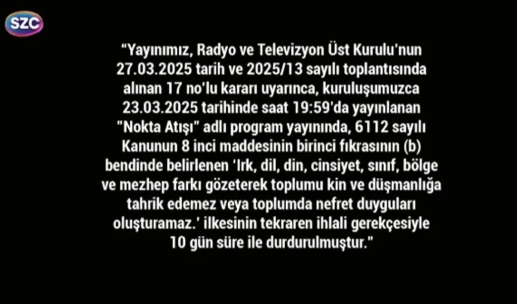 RTÜK, CHP’nin Cumhurbaşkanı adayı, tutuklanan Türkiye Belediyeler Birliği ve İstanbul Büyükşehir Belediye Başkanı Ekrem İmamoğlu’na yönelik soruşturma sırasındaki yayınları gerekçe gösterilerek Sözcü TV’ye 10 gün yayın durdurma cezası vermişti.