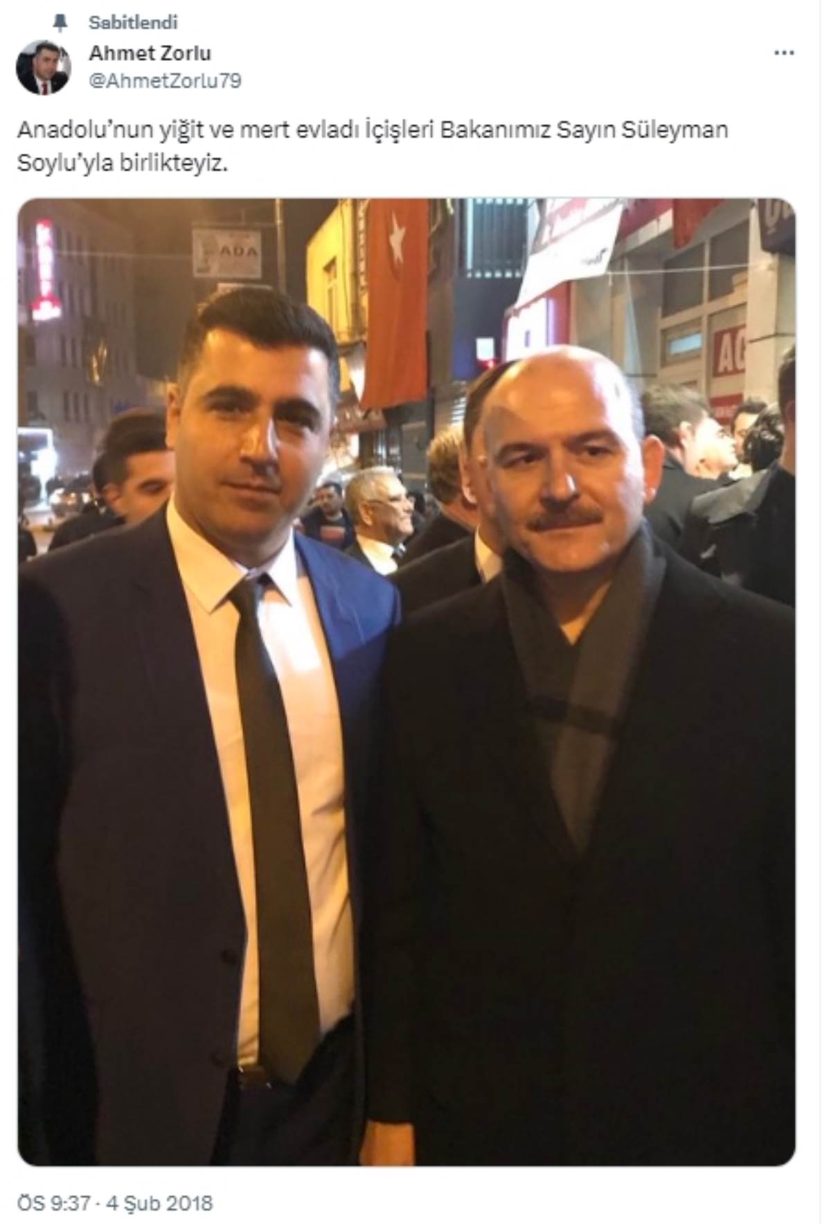 Öte yandan Ahmet Zorlu’nun eski İçişleri Bakanı Süleyman Soylu ile de fotoğrafı çıktı. Zorlu’nun Twitter’da 4 Şubat 2018’de paylaştığı fotoğrafa “Anadolu’nun yiğit ve mert evladı İçişleri Bakanımız Sayın Süleyman Soylu’yla birlikteyiz” notunu düştüğü ve bu fotoğrafı da sabitlediği görüldü.