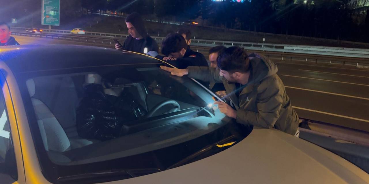Bağcılar’da otoyol kenarında park ettiği otomobilinde uyuyan sürücü, itfaiye ekiplerinin camı kırmasıyla uyandı.