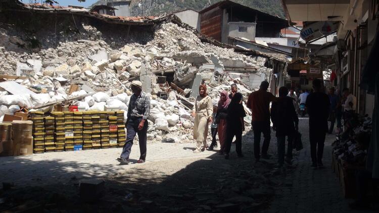 Hataylılar enkazların arasından yürüyerek açık olan dükkanlara doğru ilerliyor.