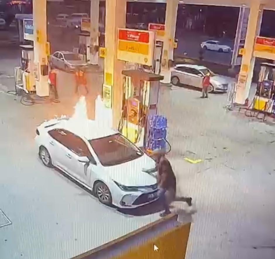 Erzincan'da akaryakıt dolumu sırasında alev alan otomobildeki baba ile kızı son anda alevlerin arasında kalmaktan kurtulurdu. O anlar akaryakıt istasyonunun güvenlik kamerasına yansıdı.